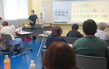 | 今回は、福祉防災サポートつむぎ代表の出原さんを講師にお招きし、『防災について』みんなで考える時間をもちました。 「非日常な日常」と題し、非常用袋の中身について意見を出し合ったり、避難の方法について等たくさんの質問が挙がりました。 「普段から防災を意識しながら生活に取り入れることで、いざという時に役立つ」「普段から使い慣れているものや、 食べ慣れているものを準備しておくことが大切」などのアドバイスから、“もしも”のために、今からできそうな事を日常に取り入れ 災害への備えについて今一度、考え直していきたいと感じました。 |