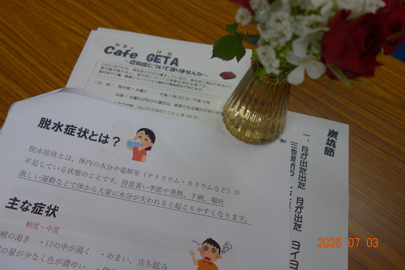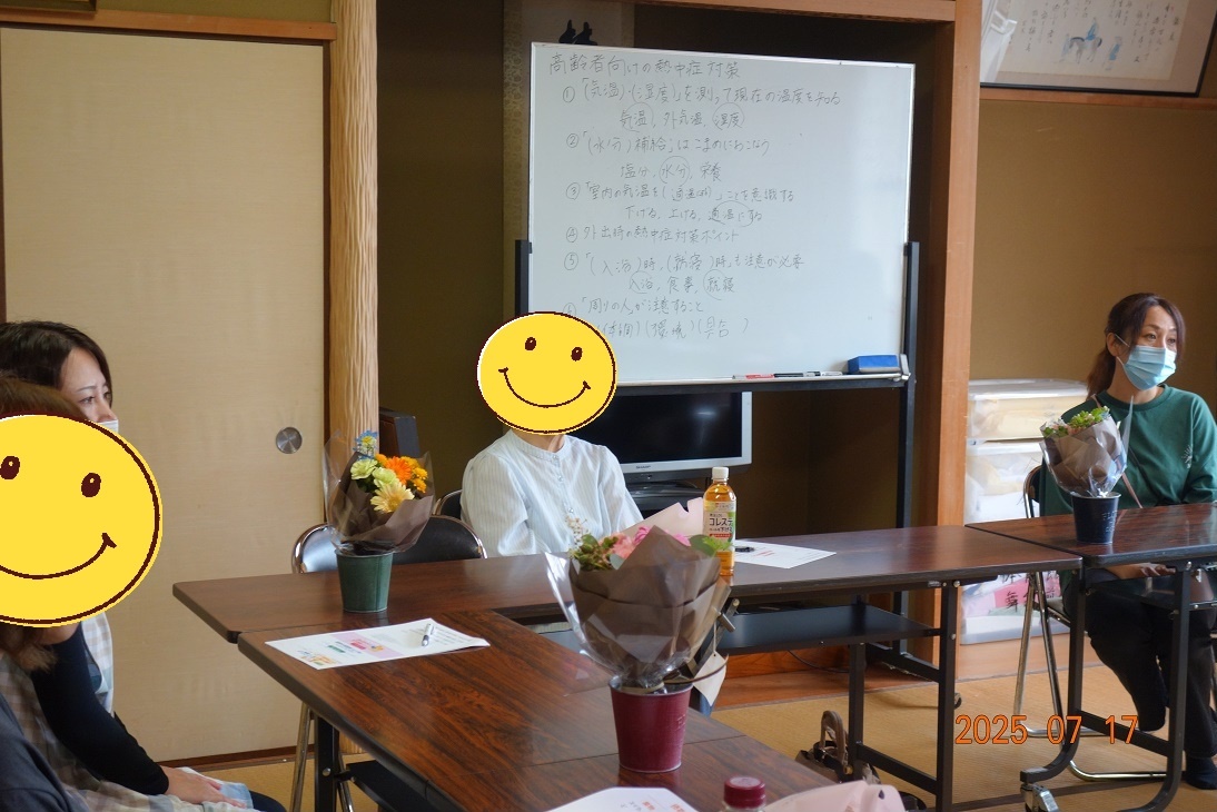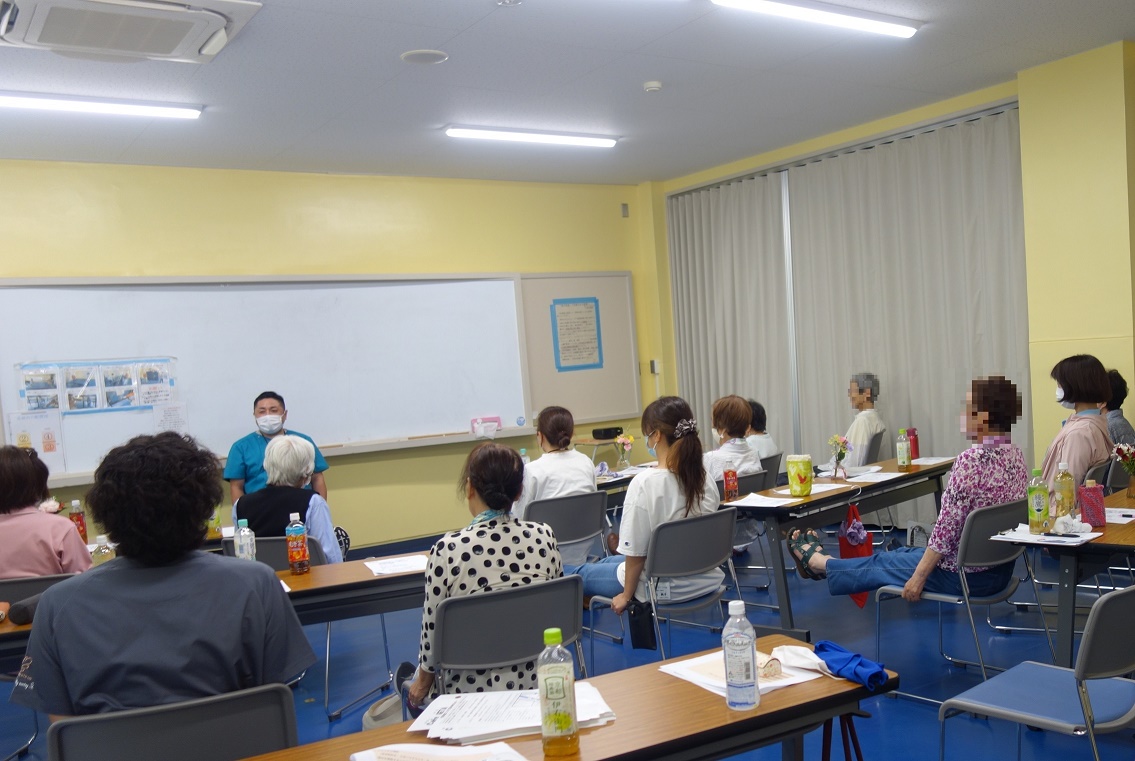 地域の方、専門職合わせて9名が集いました。 今回は、デイサービスセンターの職員から、『高齢者の水分補給のコツと熱中症対策』 をテーマにミニ講話がありました。 参加者から、「高齢の親に水分摂取を勧めてもあまり飲まない。どうやって水分を摂ってもらえばよいか」 等、悩みや質問があり、専門職からは「飲み物の種類を変えてみる」「小さめのコップに少量ずつ注ぐ」 「ゼリーにする」など様々な提案や意見があがりました。 また、日々の介護で疲れている身体と心を癒す時間も大切。 ほたるカフェがほっと一息つける場所となるよう、これからもお互いの想いを語り合ったり、交流の時間も 大切にしていきたいと感じました。 |